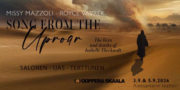 Missy Mazzolin säveltämä Song from the Uproar: The Lives and Deaths of Isabelle Eberhardt on hypnoottinen ja visuaalisesti rikas ooppera, joka vie katsojan poikkeuksellisen naisen elämän ytimeen. Teos pohjautuu sveitsiläissyntyisen seikkailijan, kirjailijan ja tutkimusmatkailijan Isabelle Eberhardtin (1877–1904) päiväkirjoihin ja teksteihin, jotka hehkuvat vapautta, levottomuutta ja palavaa halua ylittää rajoja. Nuorena orvoksi jäänyt Isabelle hylkää Euroopan ja suuntaa Pohjois-Afrikan aavikoille, eläen nomadina, usein mieheksi pukeutuneena, etsien paikkaansa maailmassa ja itsessään.